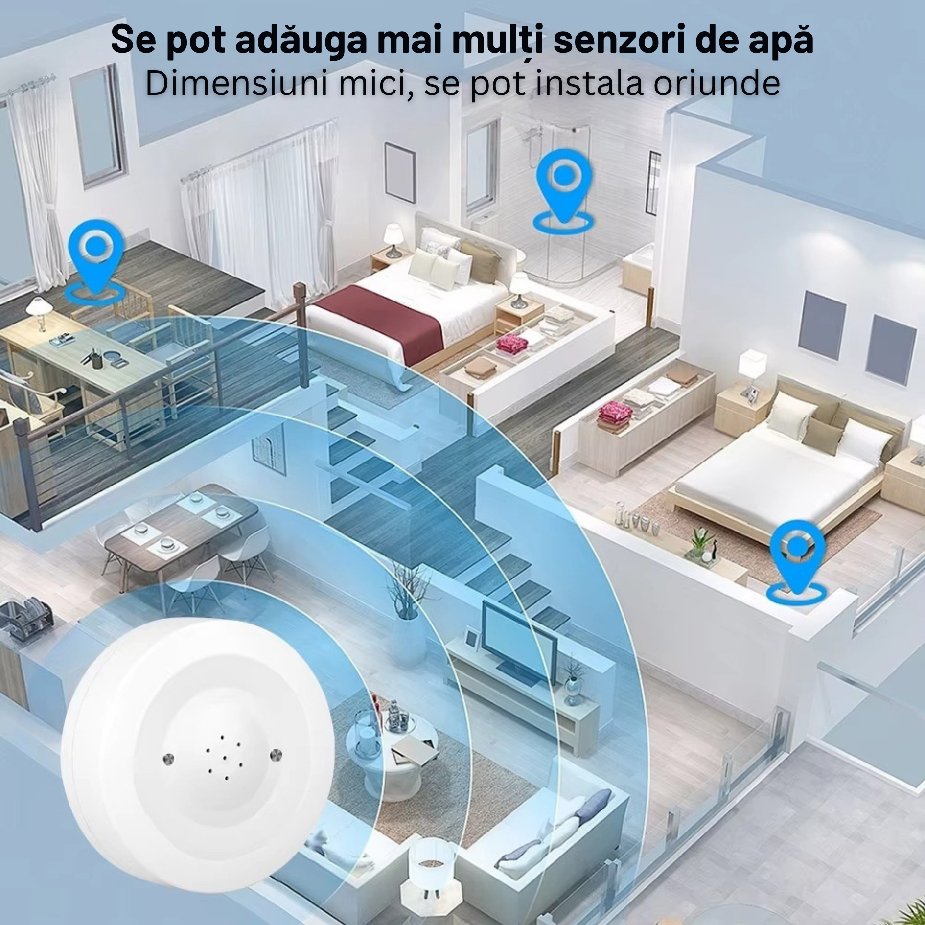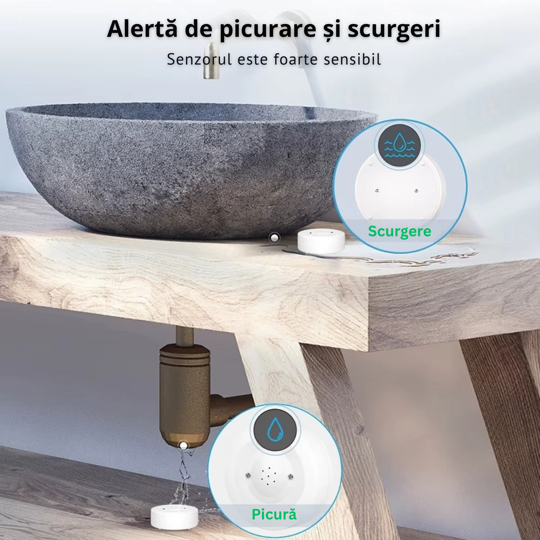 Automatizari inteligente: Se conecteaza cu alte dispozitive smart din locuinta pentru actiuni automate, precum inchiderea robinetului sau aprinderea luminii, la detectarea scurgerilor.